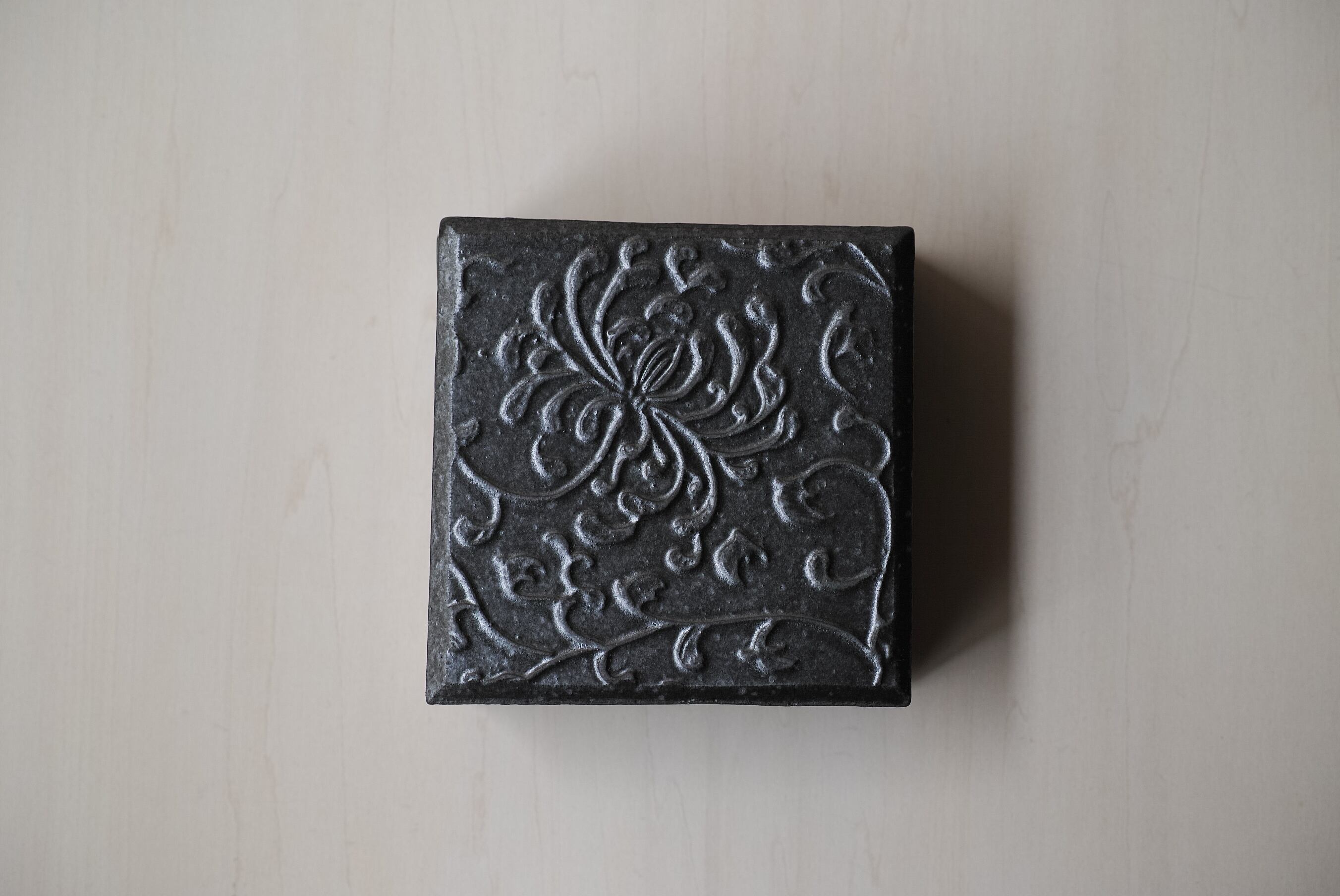 菊の模様が描かれたこの蓋物は、程よい艶を纏った魅力的な佇まい。器としての役割だけでなく、オブジェのような存在感も醸し出しています。