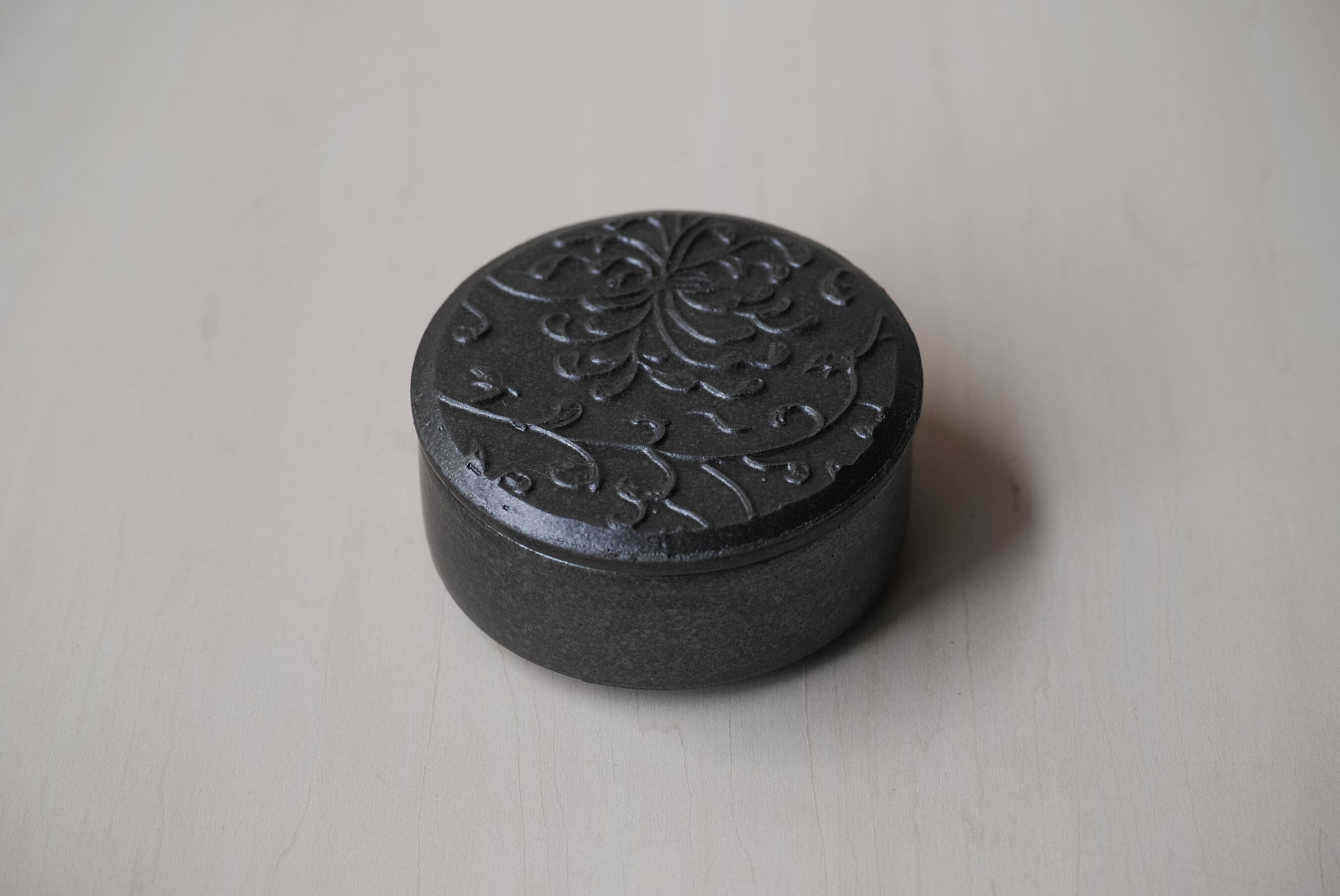 菊の模様が描かれたこの蓋物は、程よい艶を纏った魅力的な佇まい。器としての役割だけでなく、オブジェのような存在感も醸し出しています。