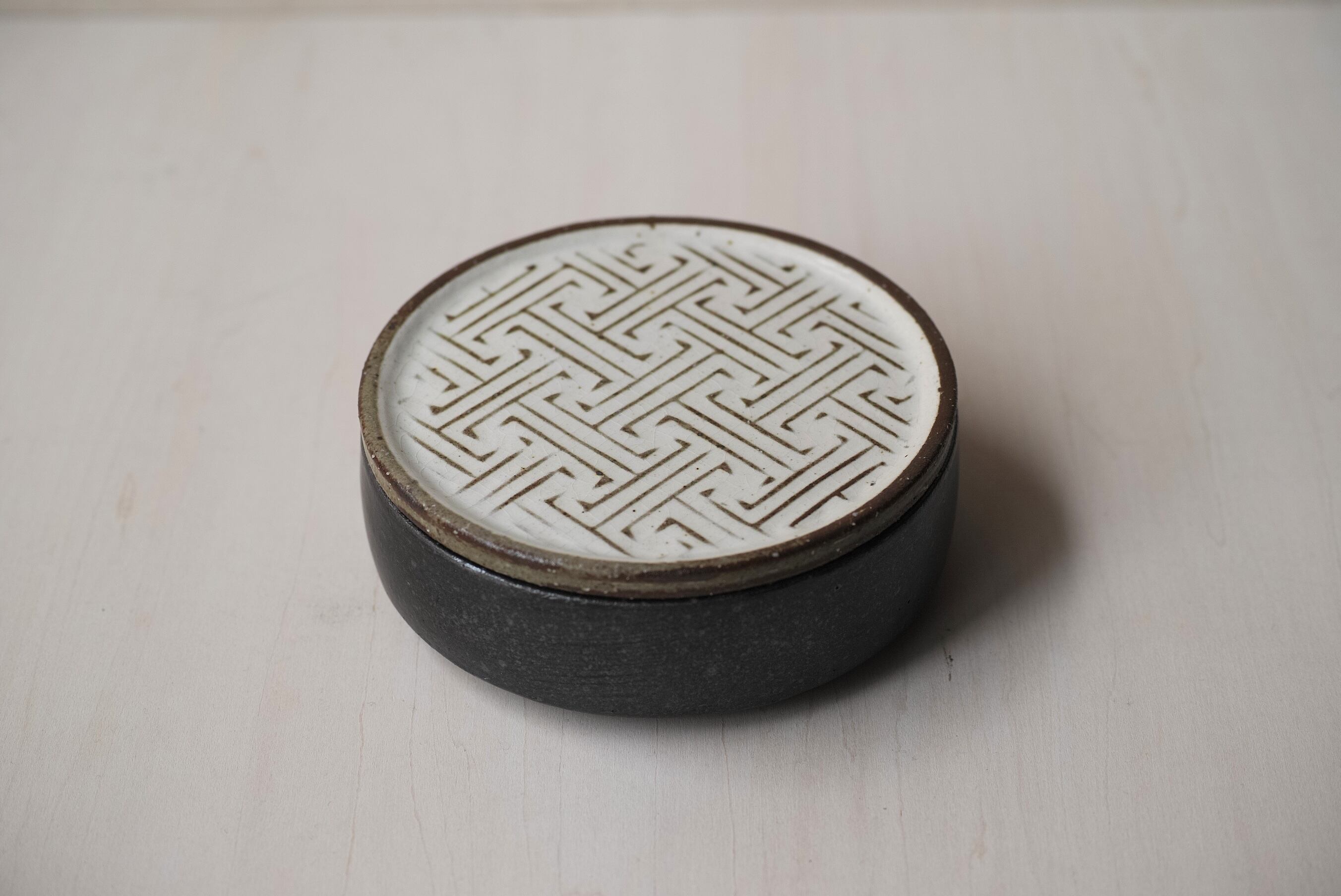 伝統的な模様を作家なりに解釈した万字模様。ずっと連なる模様は吉祥を思わせる、続く繁栄の意味も込められています。