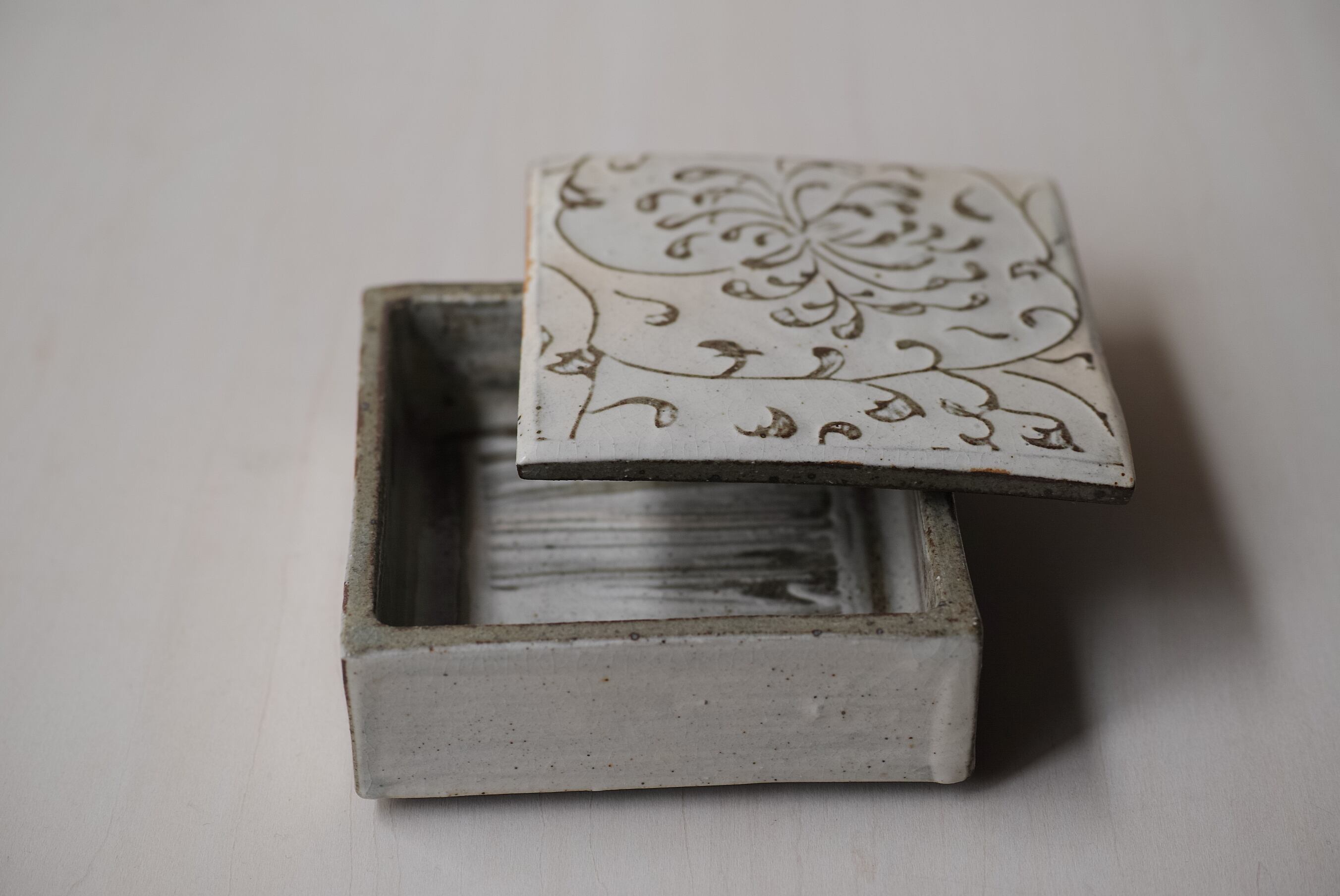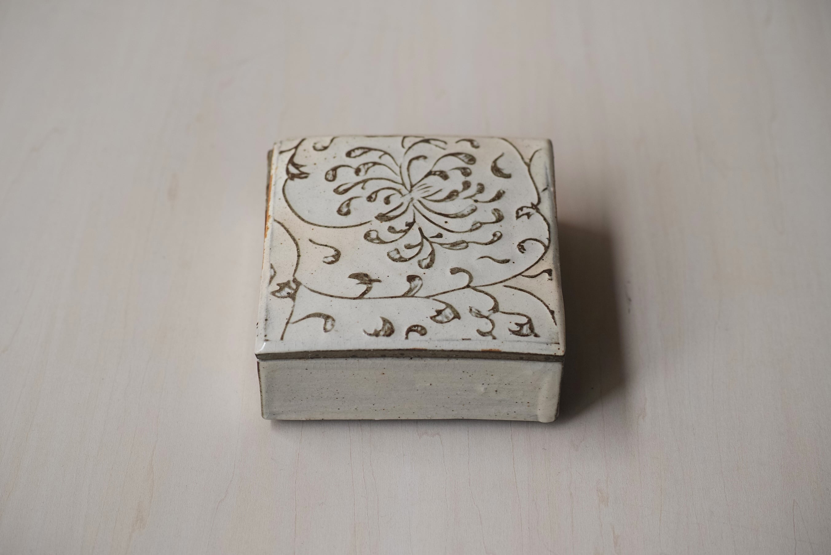 菊の模様が描かれたこの蓋物は、粉青の柔らかい表情と煙のように朱が漂う魅力的な佇まい。器としての役割だけでなく、オブジェのような存在感も醸し出しています。